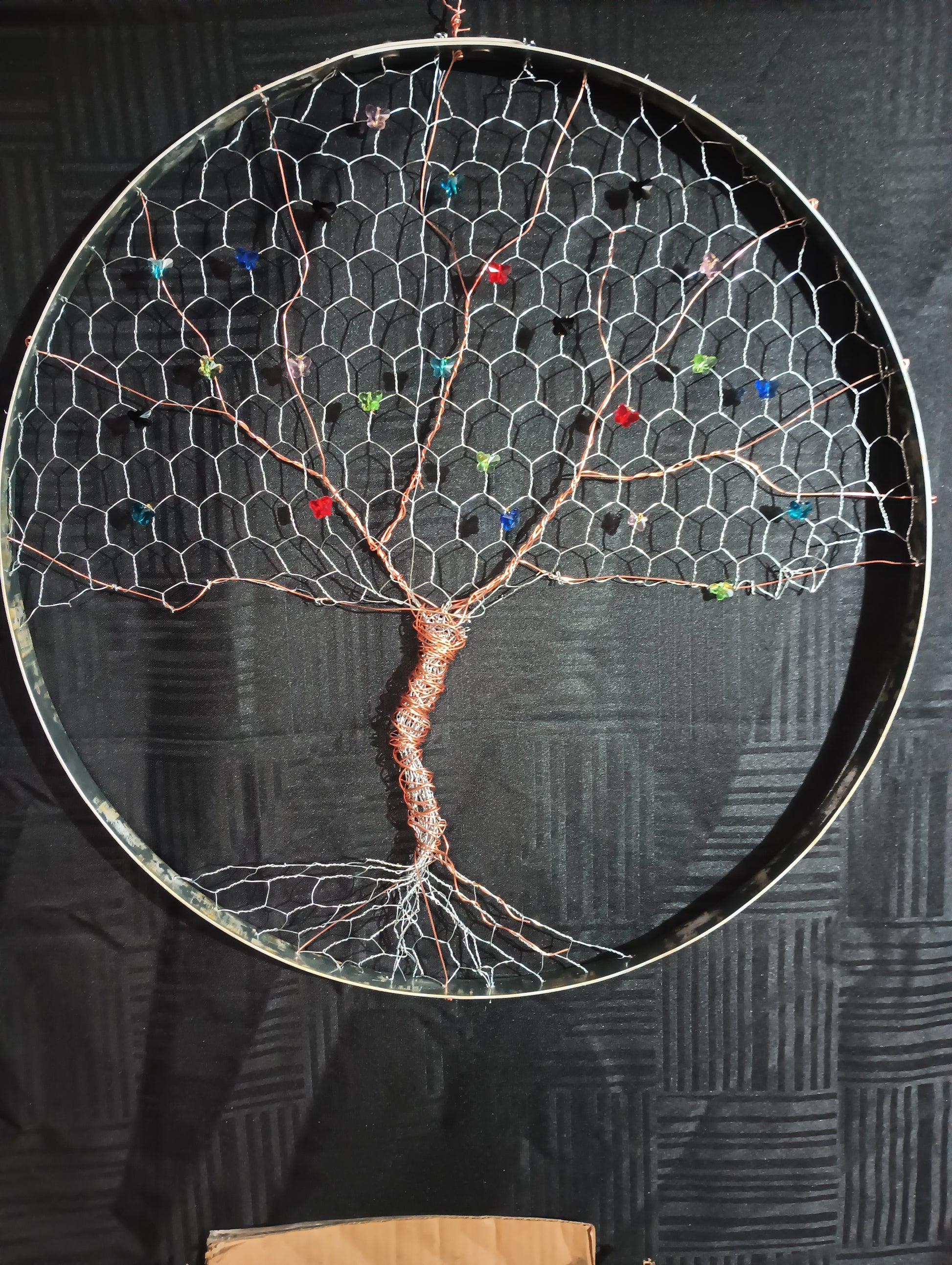 Wine barrel ring wire sculpture with a mix of chicken wire and copper. butterflies were wired in to add color. Each ring is about 28 inches by 28 inches. Every tree sculpture is one of a kind. Picture is an example. These are made when ordered.